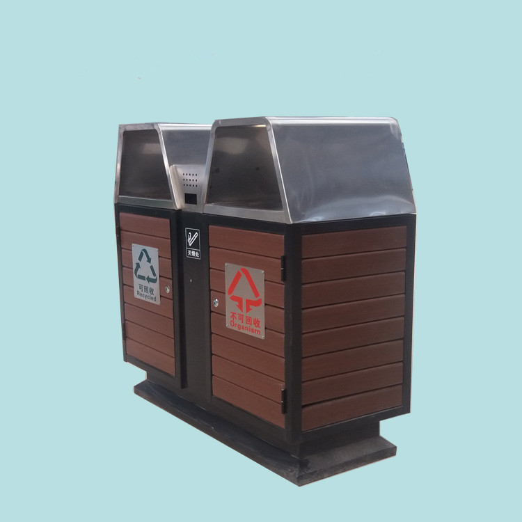 環保分類鋼木垃圾桶桶身可選用實木、防腐木、塑木等環保材料;內桶采用加厚鍍鋅板,防腐防銹能力強;桶架采用冷軋鋼板,經過酸洗除銹噴粉高溫烤漆處理。整體美觀大方、堅固耐用。